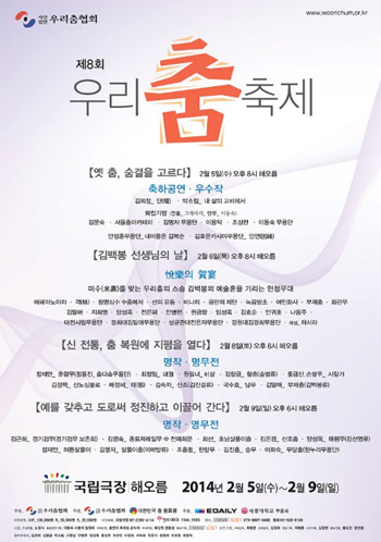 [프리뷰] 제8회 “우리춤축제” 2월 5-9일 국립극장 해오름극장 (사)우리춤협회가 주최하는 제8회 우리춤축제가 2월 5일부터 9일까지 국립극장 해오름극장에서 열린다. 총 32명의 안무자 및 무용수